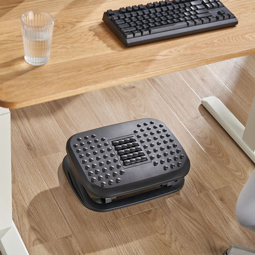 Maximal komfort för dina fötter – varje dag på jobbet.Säg hej då till obehag och hej till en ny nivå av fotkomfort under långa arbetsdagar. Det här ergonomiskt utformade fotstödet lindrar tryck och spänningar med justerbar höjd och lutning för en skräddarsydd upplevelse. Massagerullar och upphöjda mönster stimulerar fotsulorna för avslappning och ökad cirkulation. Halkskydd på undersidan ser till att fotstödet ligger stadigt och ger en trygg och bekväm plats för dina fötter – hela dagen.Detta robusta fotstöd är designat för daglig användning och ger både komfort och stöd under hela arbetsdagen. Den ergonomiska formen hjälper till att sträcka ut benen och främjar blodcirkulationen, medan den lutande plattformen och höjdjusteringen gör det enkelt att hitta en bekväm position som passar just dig. Inbyggda massagehjul och upphöjda mönster stimulerar fotsulorna och lindrar spänningar. Halkskydd undertill förhindrar att fotstödet glider och skyddar samtidigt golvet från repor – ett perfekt tillskott till en ergonomisk arbetsmiljö.Specifikationer