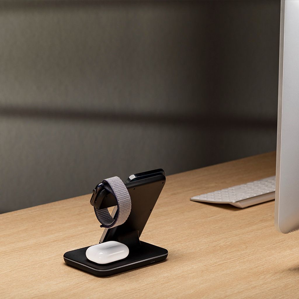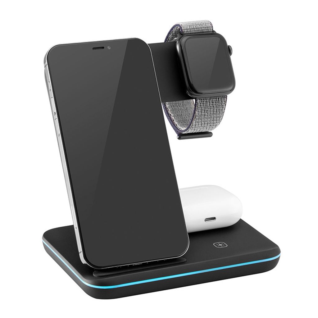 Ladda din Qi-standard smartphone, smartklocka och hörlurar samtidigt med tre laddningsytor. Utrustad med främmande föremålsdetektion och temperaturkontroll för extra säkerhet. LED-ljuslisten visar laddningsstatus och kan stängas av med en lätt beröring när du sover eller vilar.