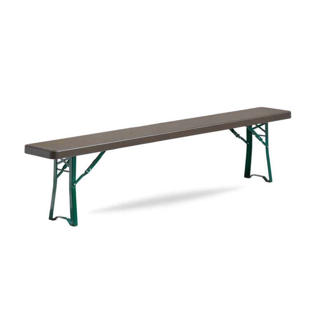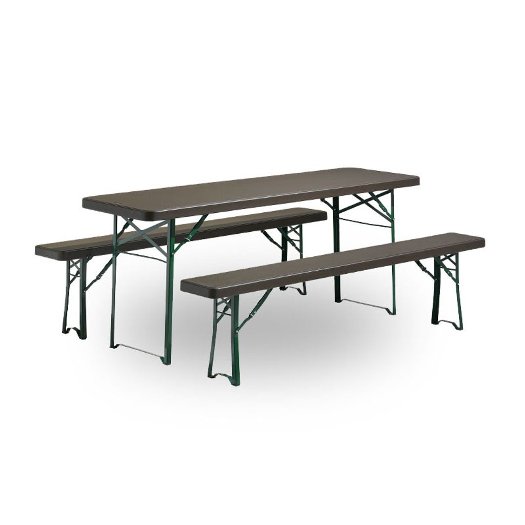 Munich bänkset med brun skiva i högdensitetspolyeten, stativet är en grön pulverlackad stålställning. Bänksetet passar till 8 personer och passar utmärkt både inomhus och utomhus. Munich ingår i vårt Premium sortiment då produkten håller extra hóg kvalitet.