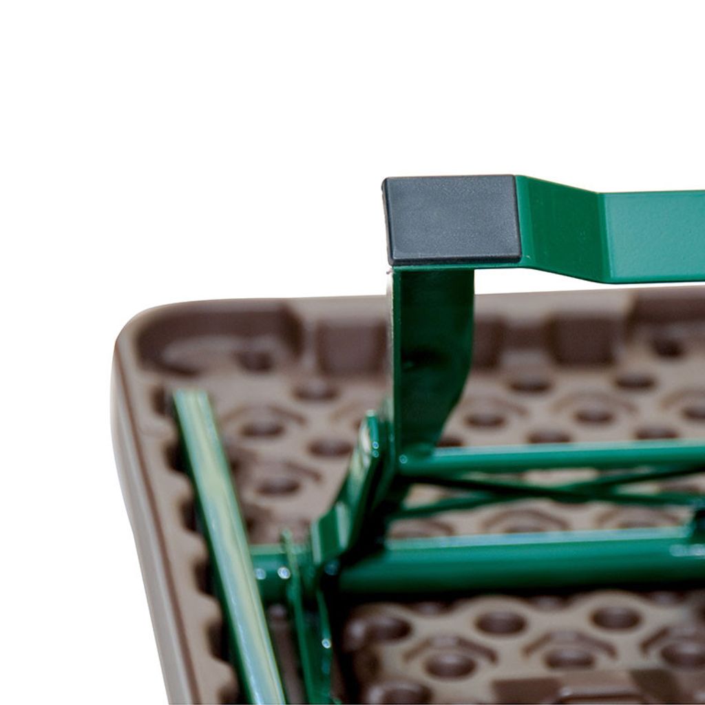 Munich bänkset med brun skiva i högdensitetspolyeten, stativet är en grön pulverlackad stålställning. Bänksetet passar till 8 personer och passar utmärkt både inomhus och utomhus.