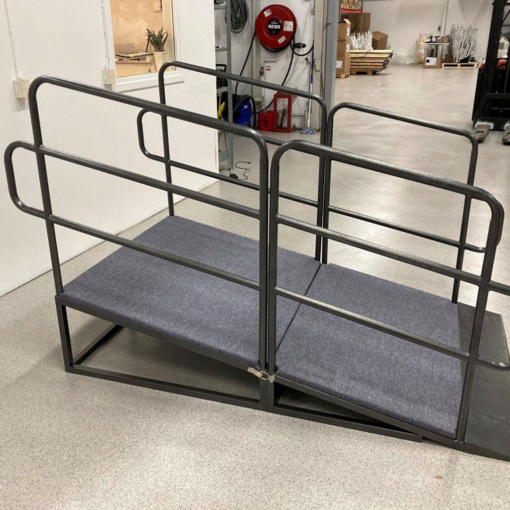 En funktionell ramp klädd i grå matta passande till fällbar scen. Rampen är fällbar och utrustad med skyddsräcke. Utmärkt för tillfällen där det ska vara enkelt att äntra scenen som uppträdanden, bufféer och utbildningar. Rampen förenklar för rullstolsbundna.