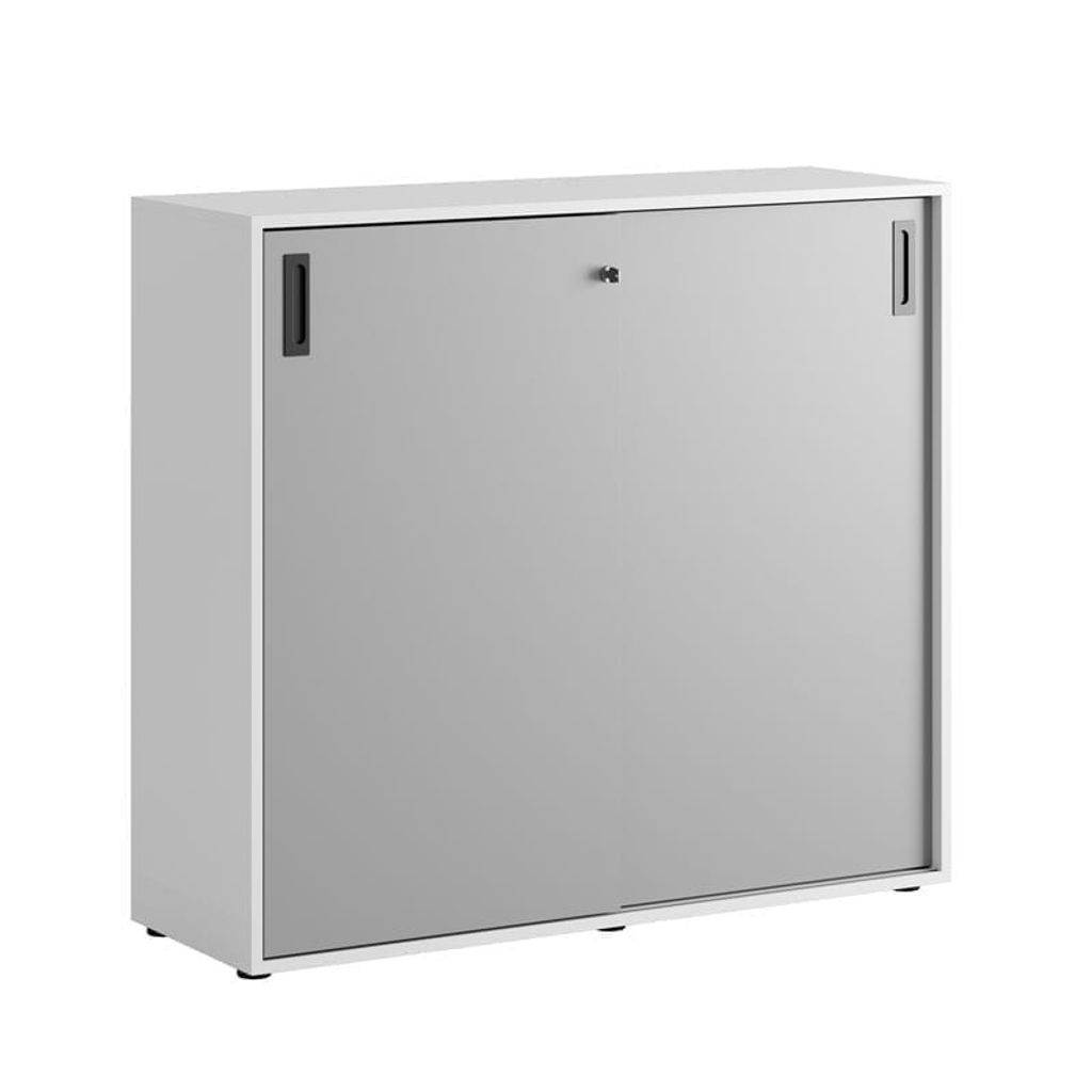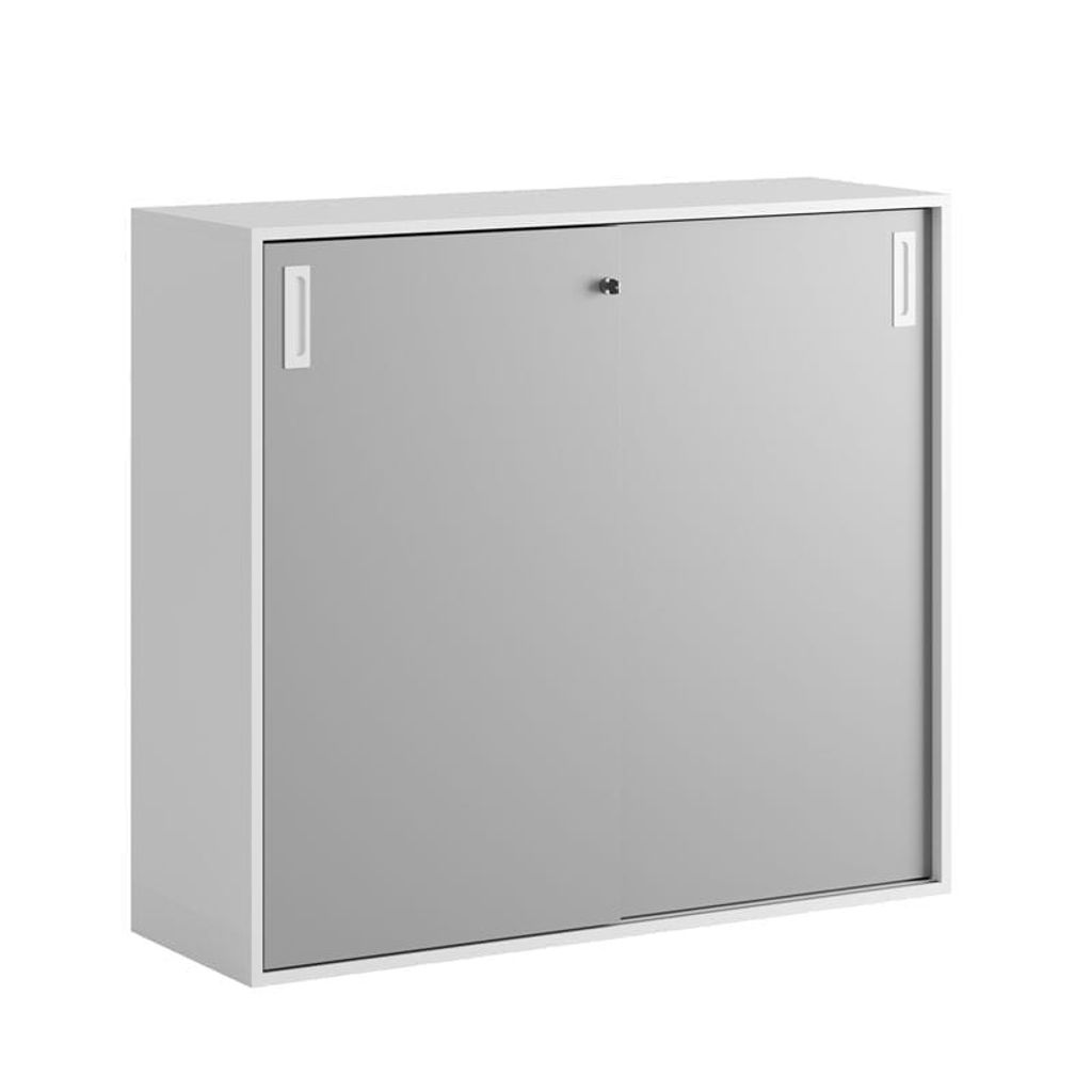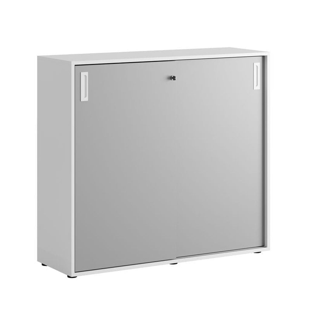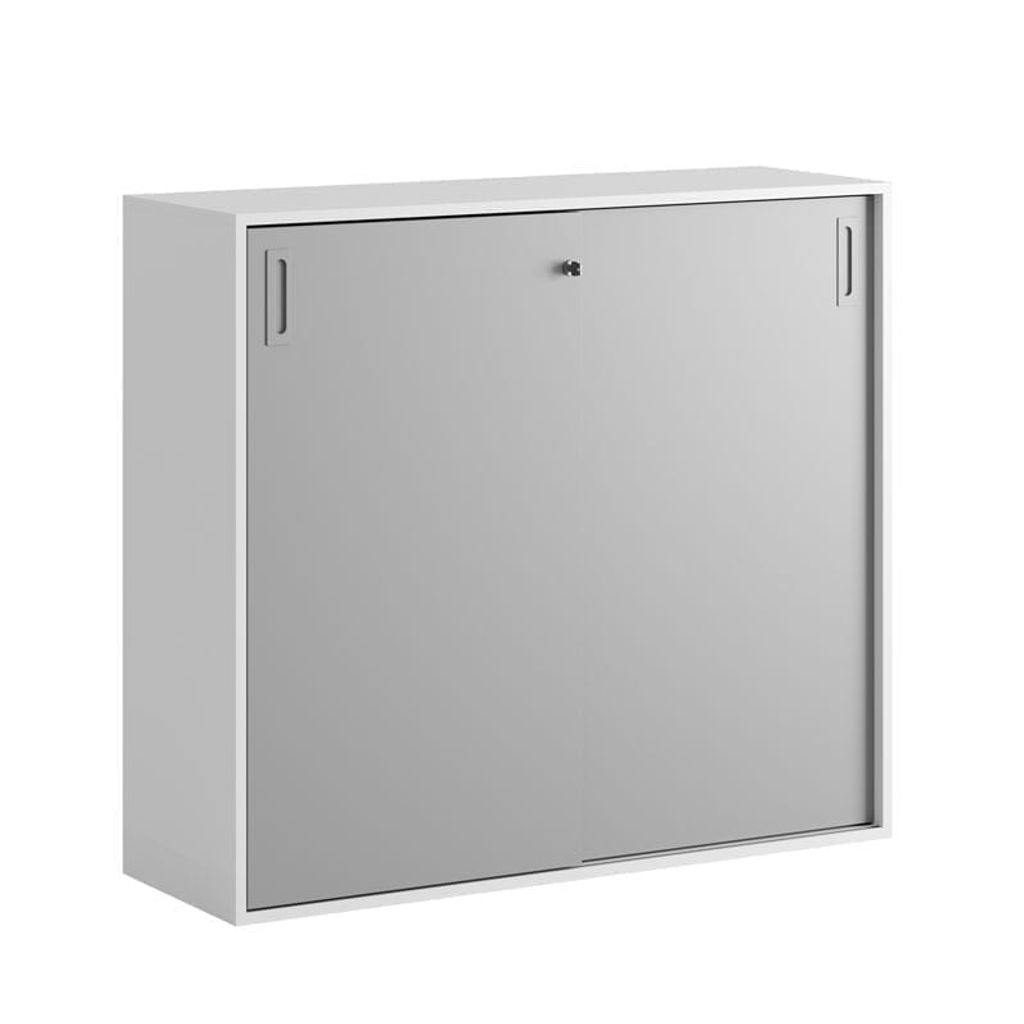 Vitt skåp med grå skjutdörrar 120x40x107,5 cm i Modify serien är framtagna för kunder som vill ha många valmöjligheter. Skåpet rymmer 3 pärmar på höjden. Lås med 2 nycklar ingår.