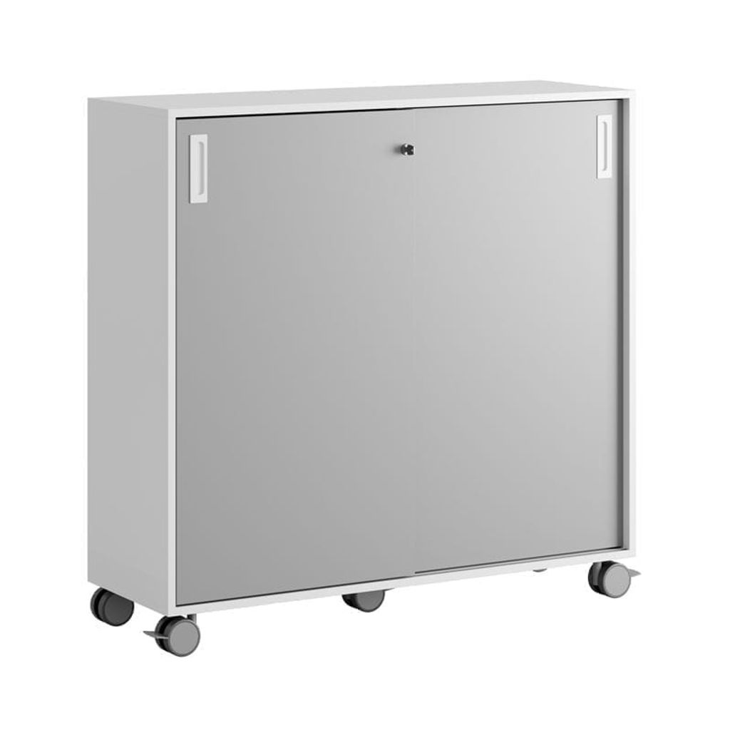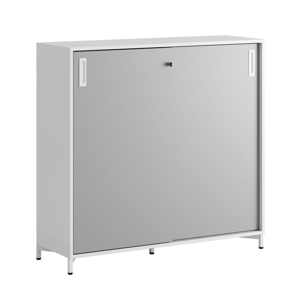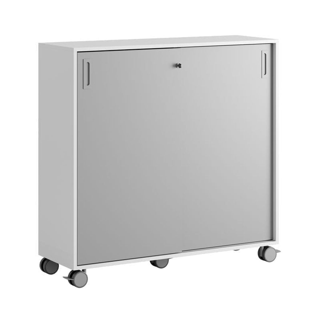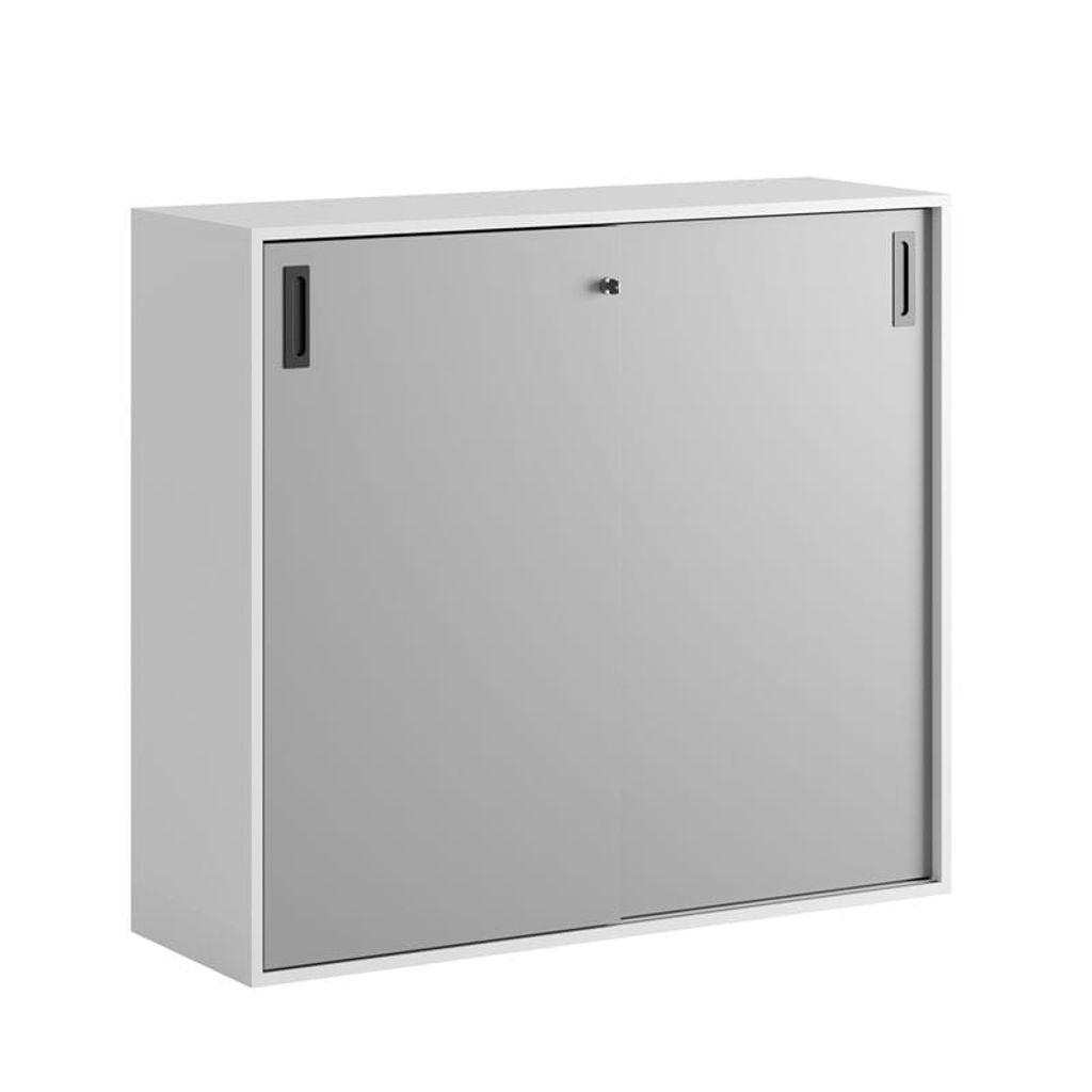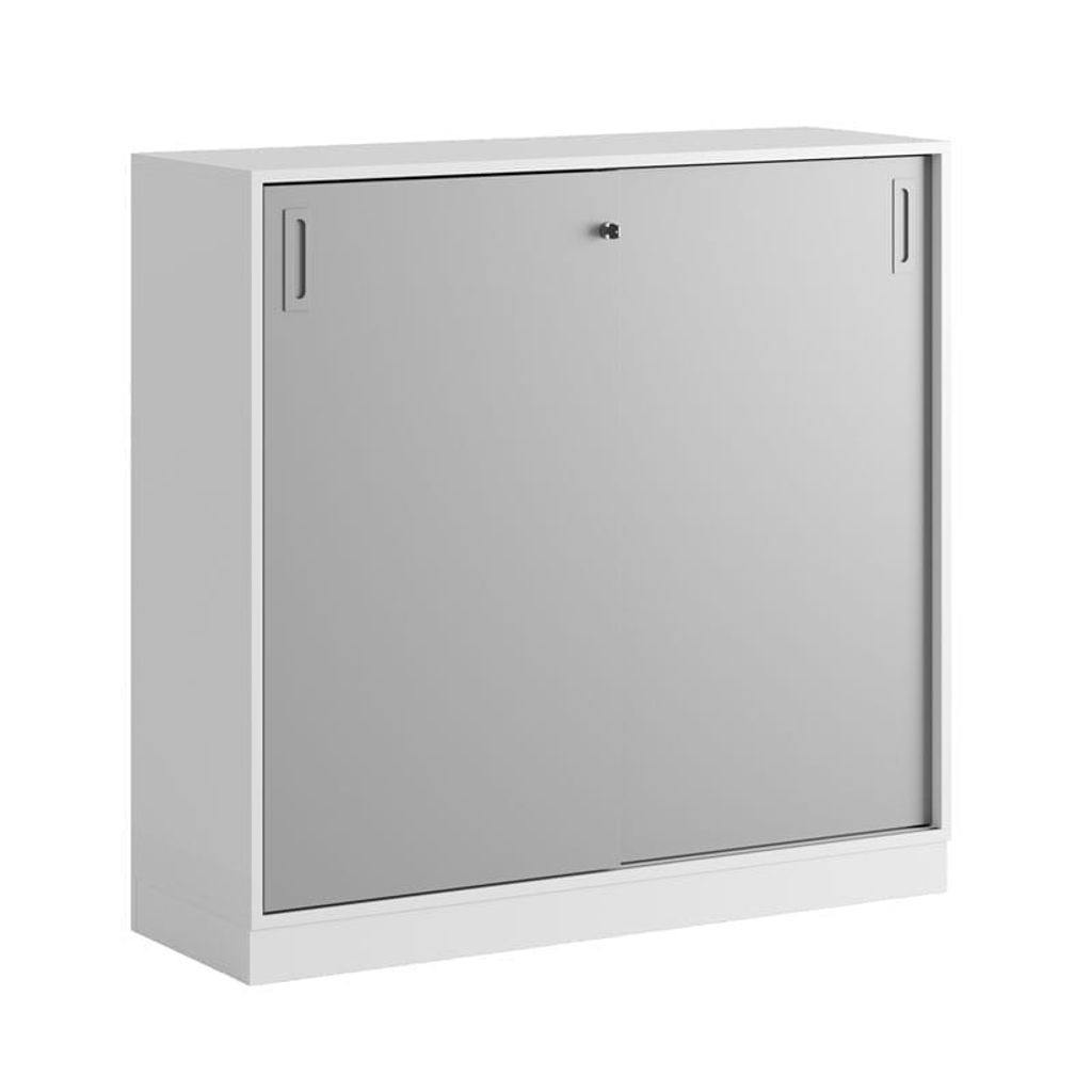 Vitt skåp med grå skjutdörrar 120x40x107,5 cm i Modify serien är framtagna för kunder som vill ha många valmöjligheter. Skåpet rymmer 3 pärmar på höjden. Lås med 2 nycklar ingår.