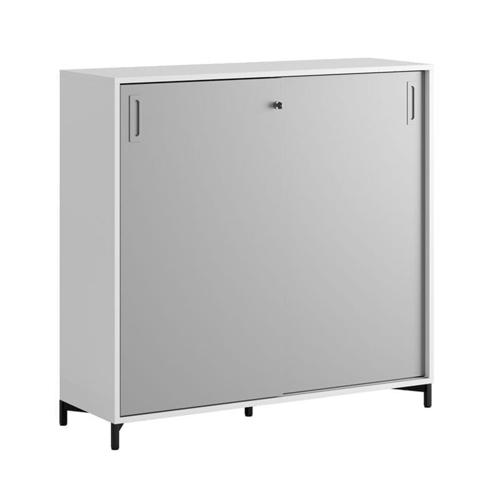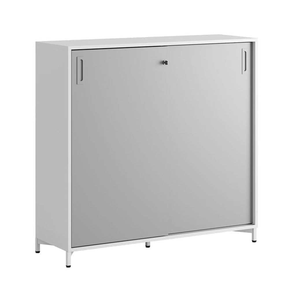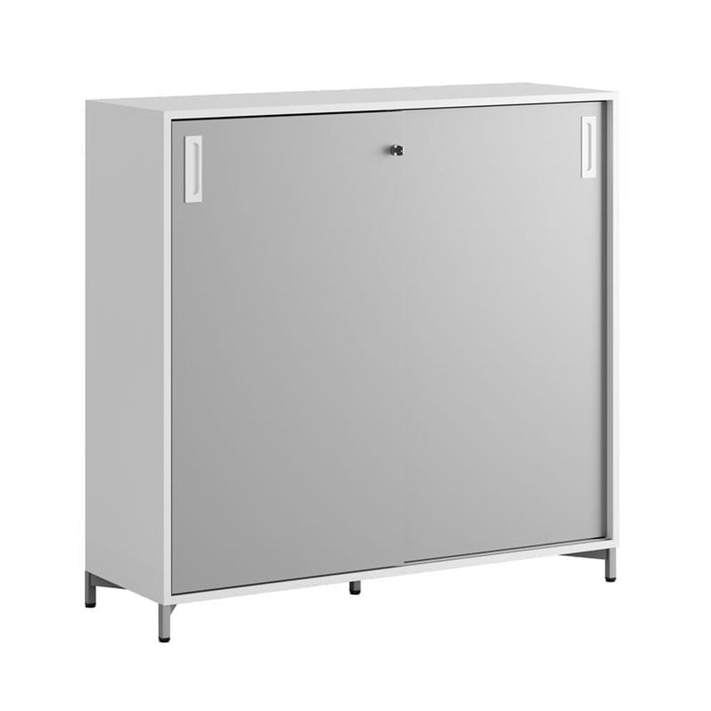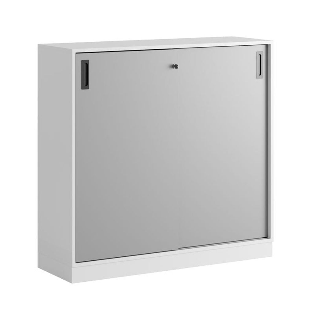 Vitt skåp med grå skjutdörrar 120x40x107,5 cm i Modify serien är framtagna för kunder som vill ha många valmöjligheter. Skåpet rymmer 3 pärmar på höjden. Lås med 2 nycklar ingår.