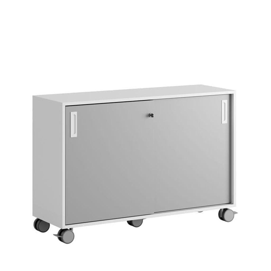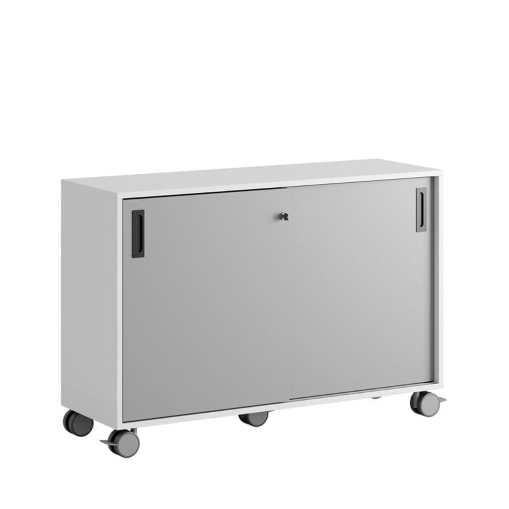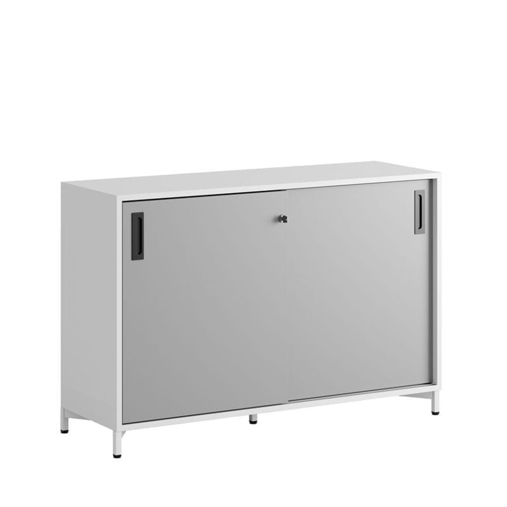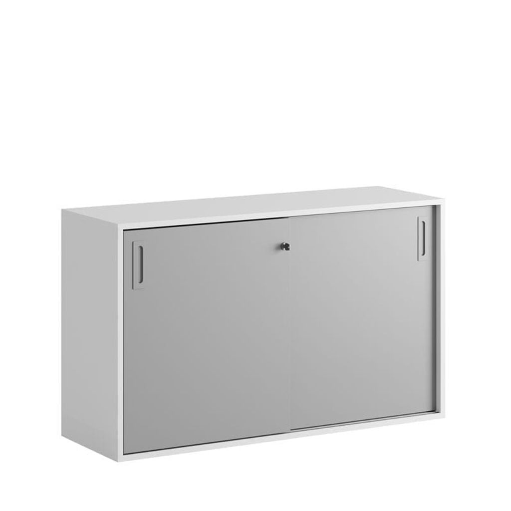 Vitt skåp med grå skjutdörrar 120x40x72 cm i Modify serien är framtagna för kunder som vill ha många valmöjligheter. Skåpet rymmer 2 pärmar på höjden. Lås med 2 nycklar ingår.