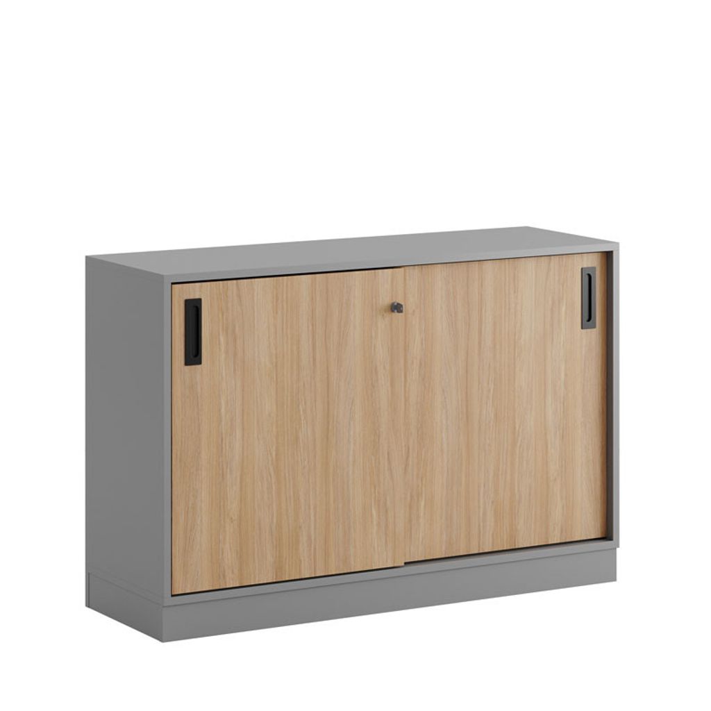Modify Skjutdörrskåp 120x40x72 cm med grå stomme och urban oak dörrar. Förvaringsskåpet beställs monterat eller omonterat med 5 olika val av underreden: stomme utan underrede, sockel, plastfötter, stålben eller hjul. Dom olika valen av underreden och handtag finns i olika färger.