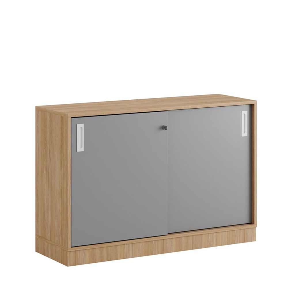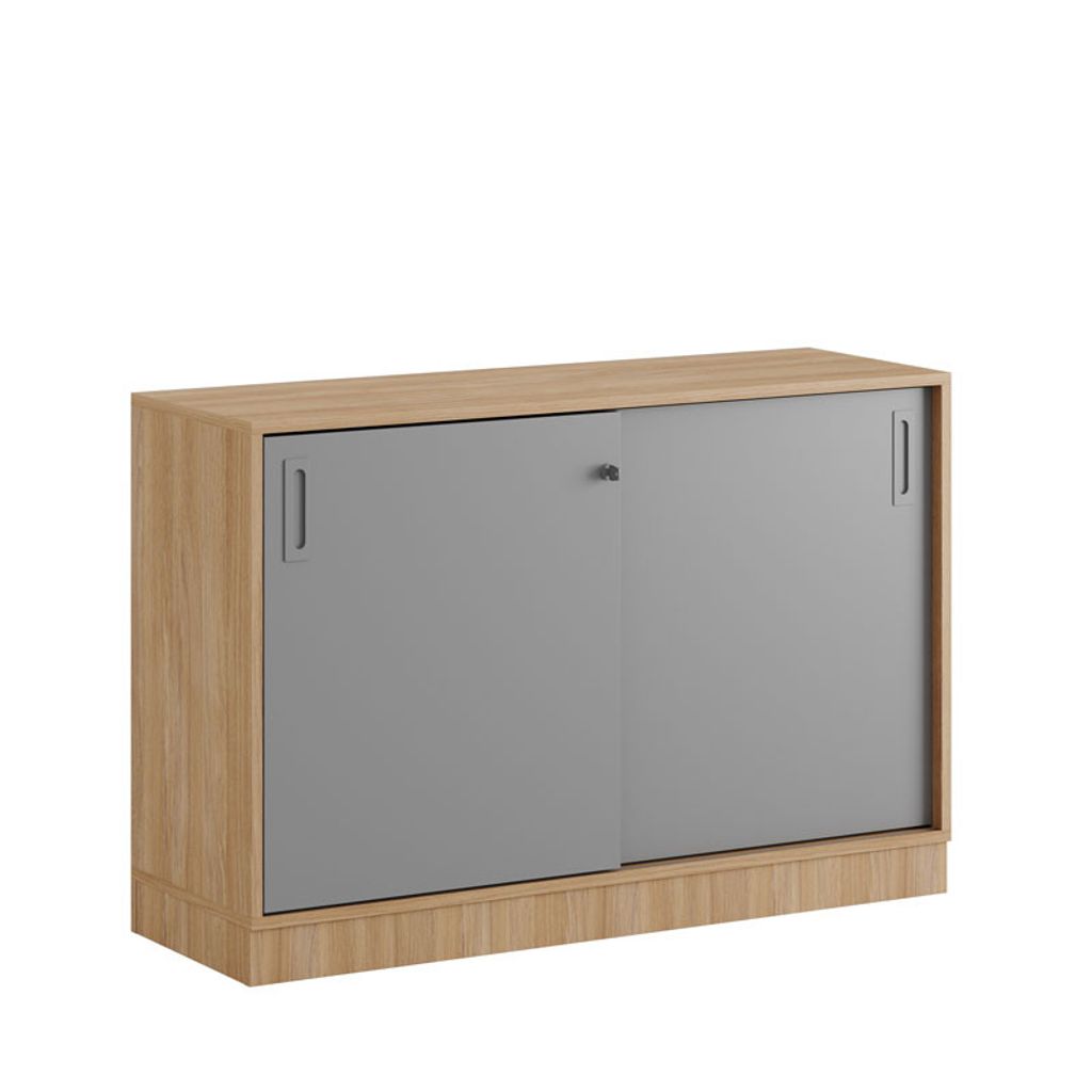 Modify Skjutdörrskåp 120x40x72 cm med urban oak stomme och grå dörrar. Förvaringsskåpet beställs monterat eller omonterat med 5 olika val av underreden: stomme utan underrede, sockel, plastfötter, stålben eller hjul. Dom olika valen av underreden och handtag finns i olika färger.