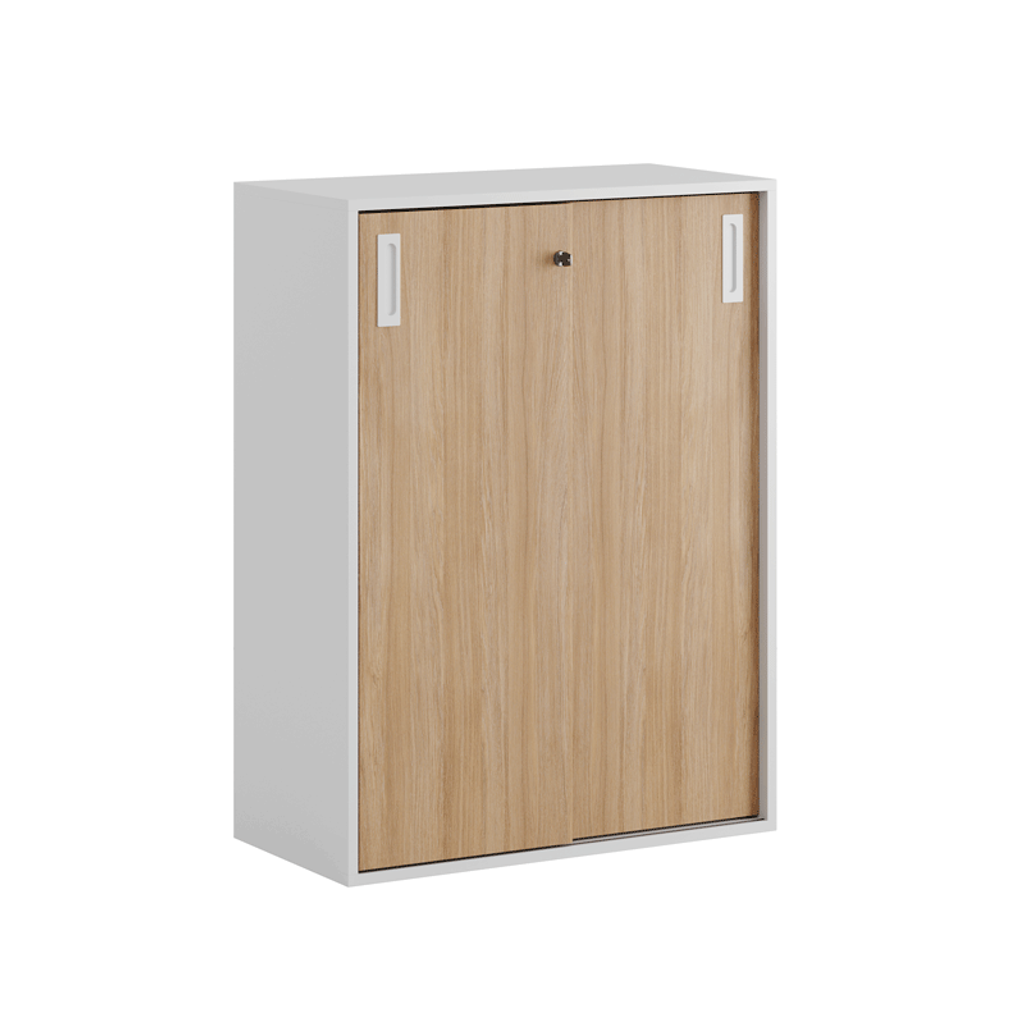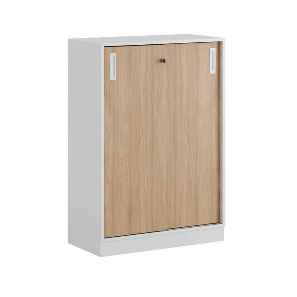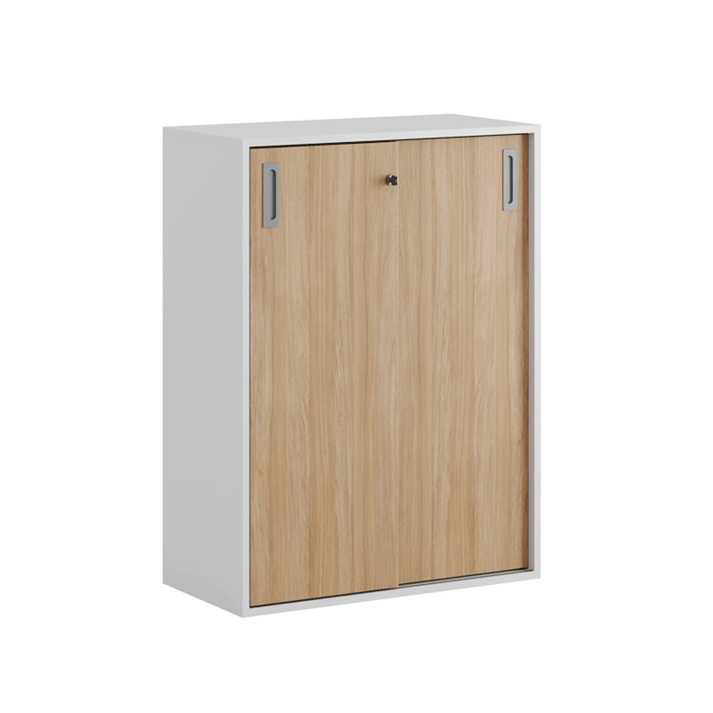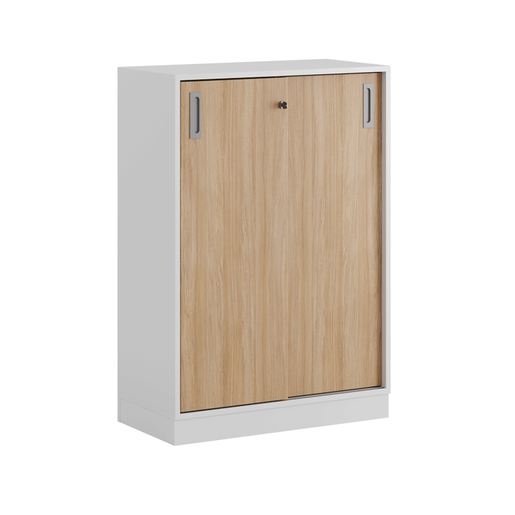 Vitt skåp med ek skjutdörrar i Modify serien är framtagna för kunder som vill ha många valmöjligheter. Skåpet rymmer 3 pärmar på höjden. Lås med 2 nycklar ingår.