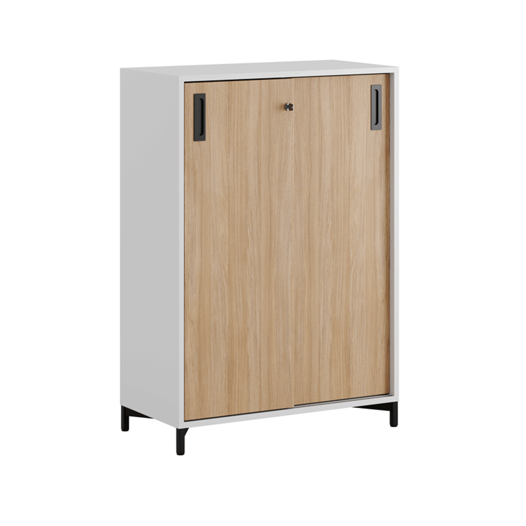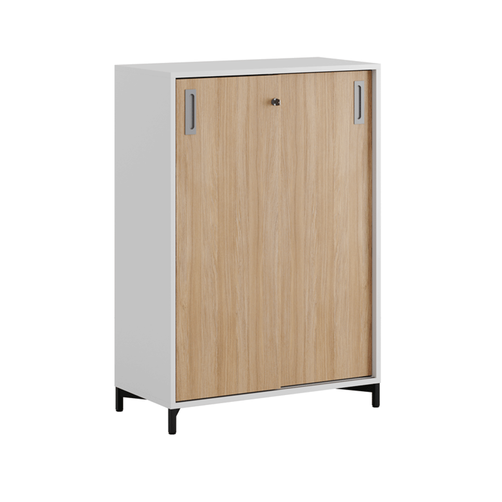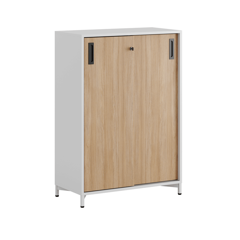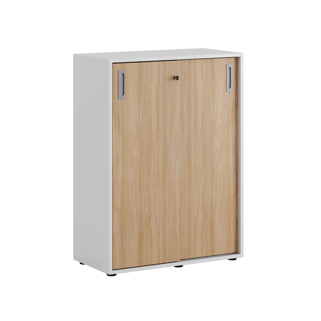 Vitt skåp med ek skjutdörrar i Modify serien är framtagna för kunder som vill ha många valmöjligheter. Skåpet rymmer 3 pärmar på höjden. Lås med 2 nycklar ingår.