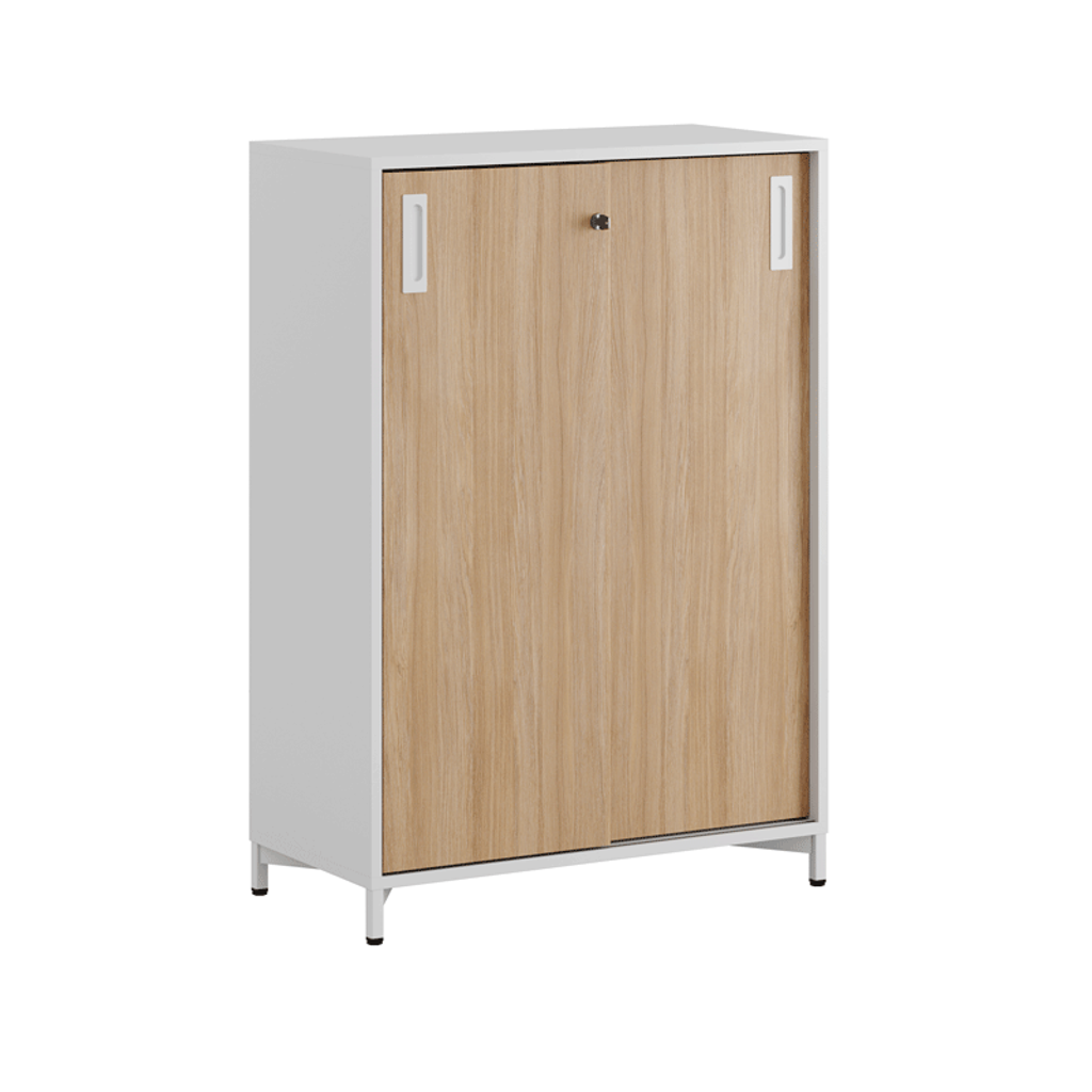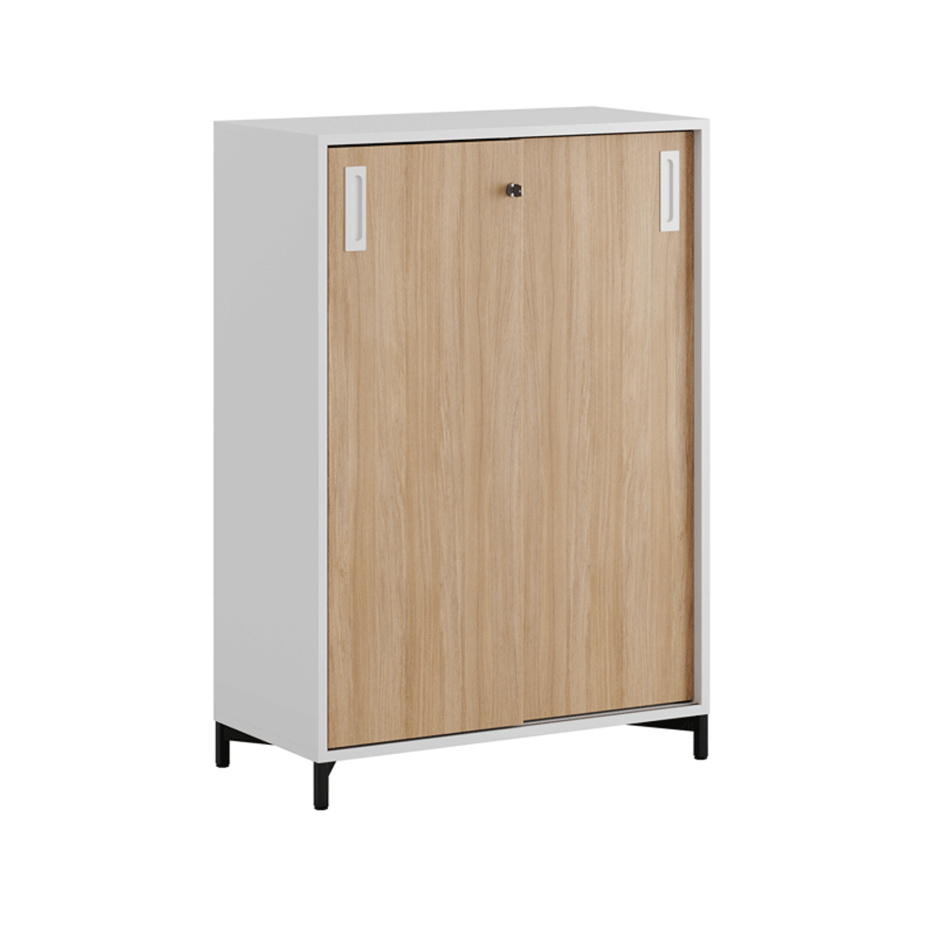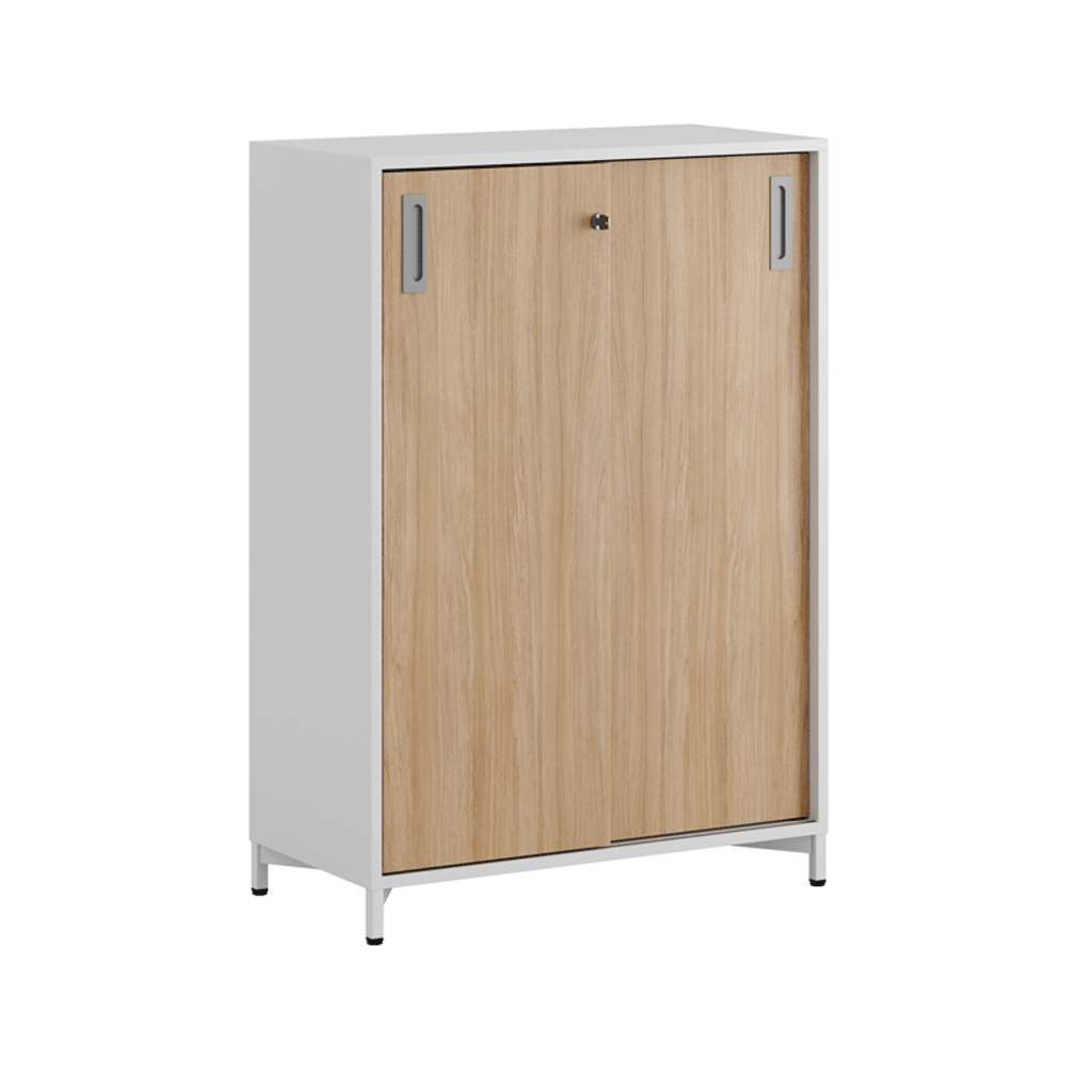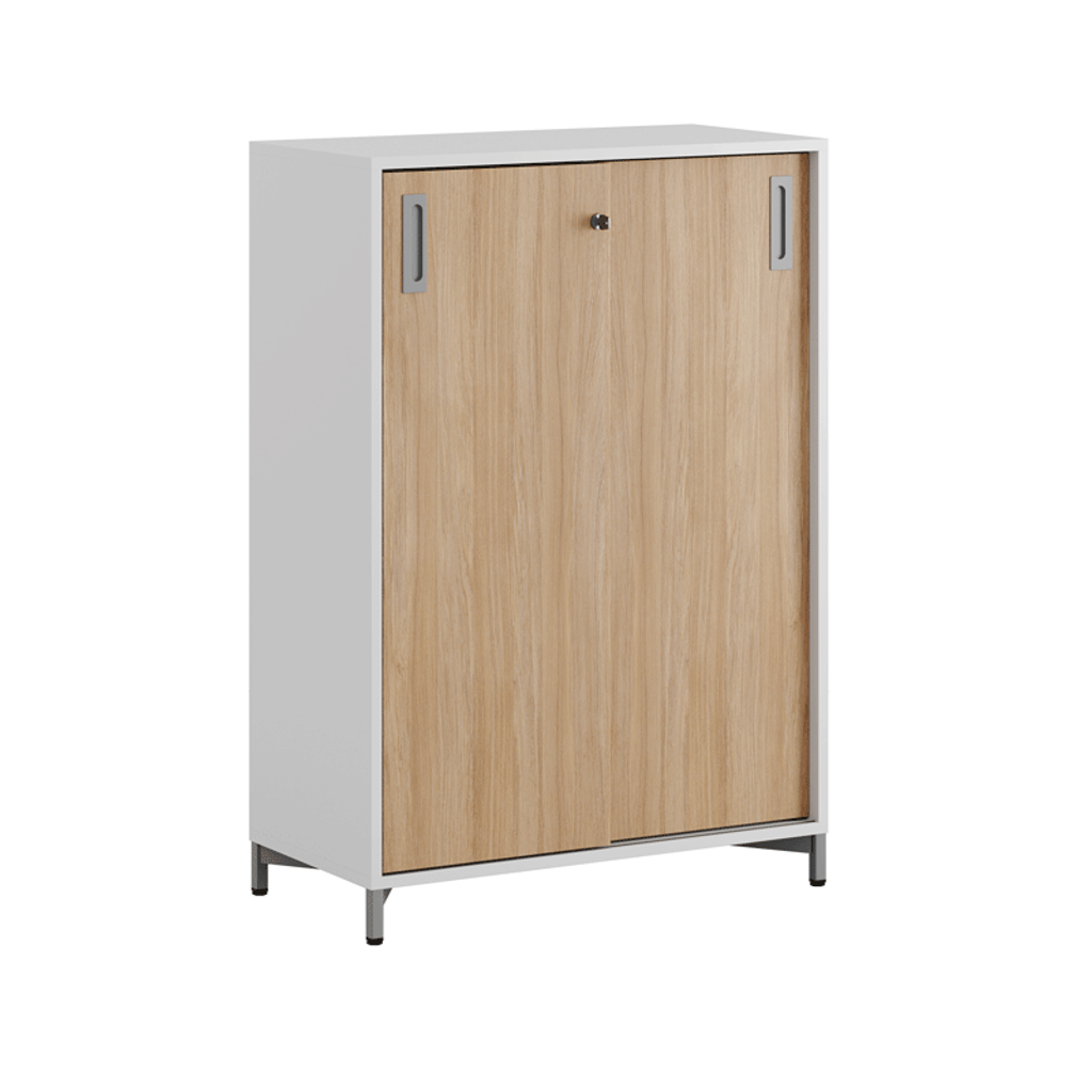 Vitt skåp med ek skjutdörrar i Modify serien är framtagna för kunder som vill ha många valmöjligheter. Skåpet rymmer 3 pärmar på höjden. Lås med 2 nycklar ingår.