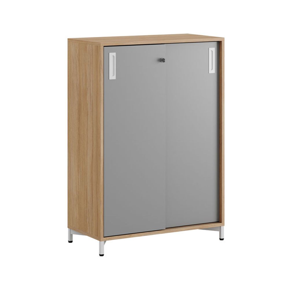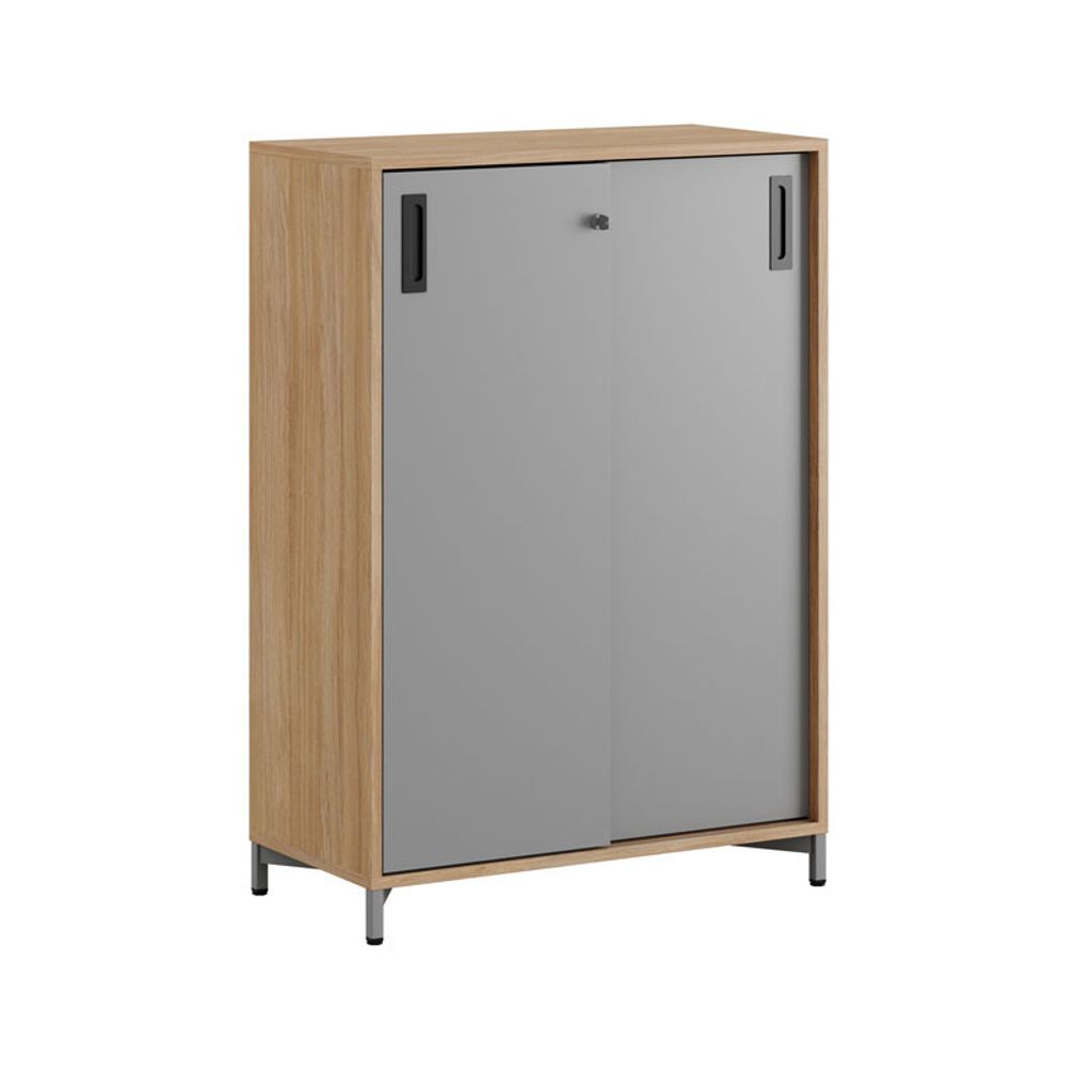Modify Skjutdörrskåp 80x40x107,5 cm med urban oak stomme och grå dörrar. Förvaringsskåpet beställs monterat eller omonterat med 5 olika val av underreden: stomme utan underrede, sockel, plastfötter, stålben eller hjul. Dom olika valen av underreden och handtag finns i olika färger.