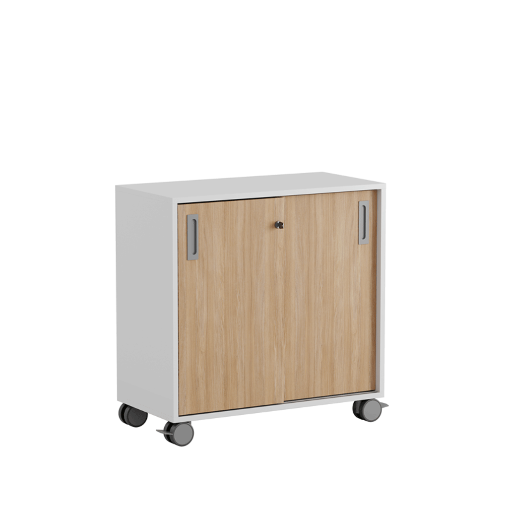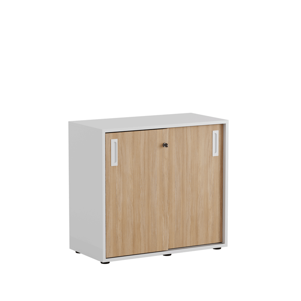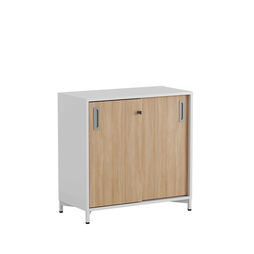 Vitt skåp med skjutdörrar i ek 80x40x72 cm i Modify serien är framtagna för kunder som vill ha många valmöjligheter. Skåpet rymmer 2 pärmar på höjden. Lås med 2 nycklar ingår.