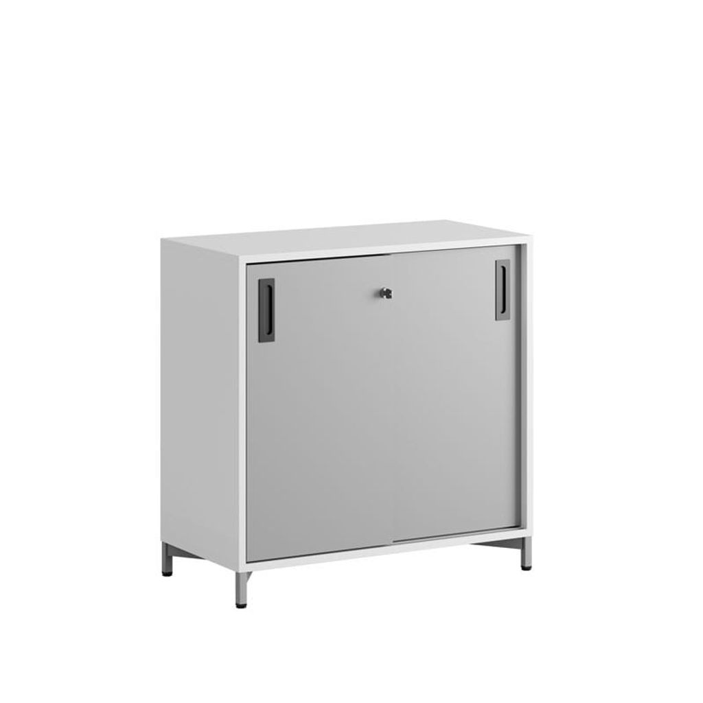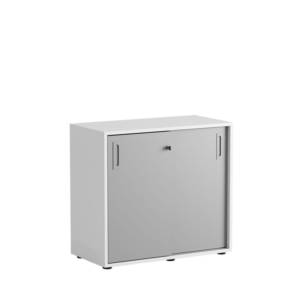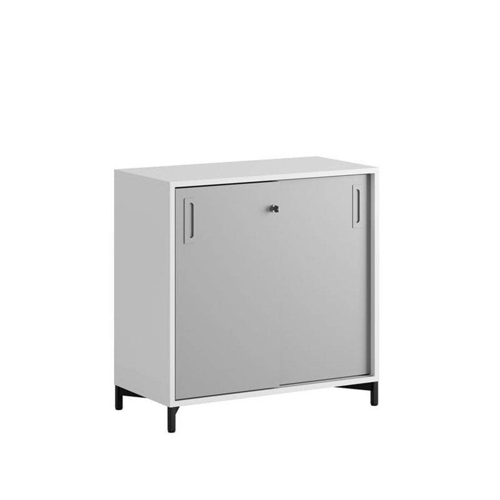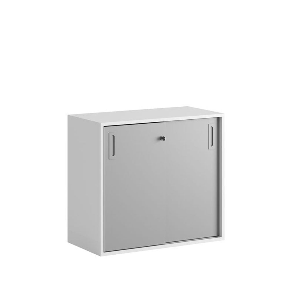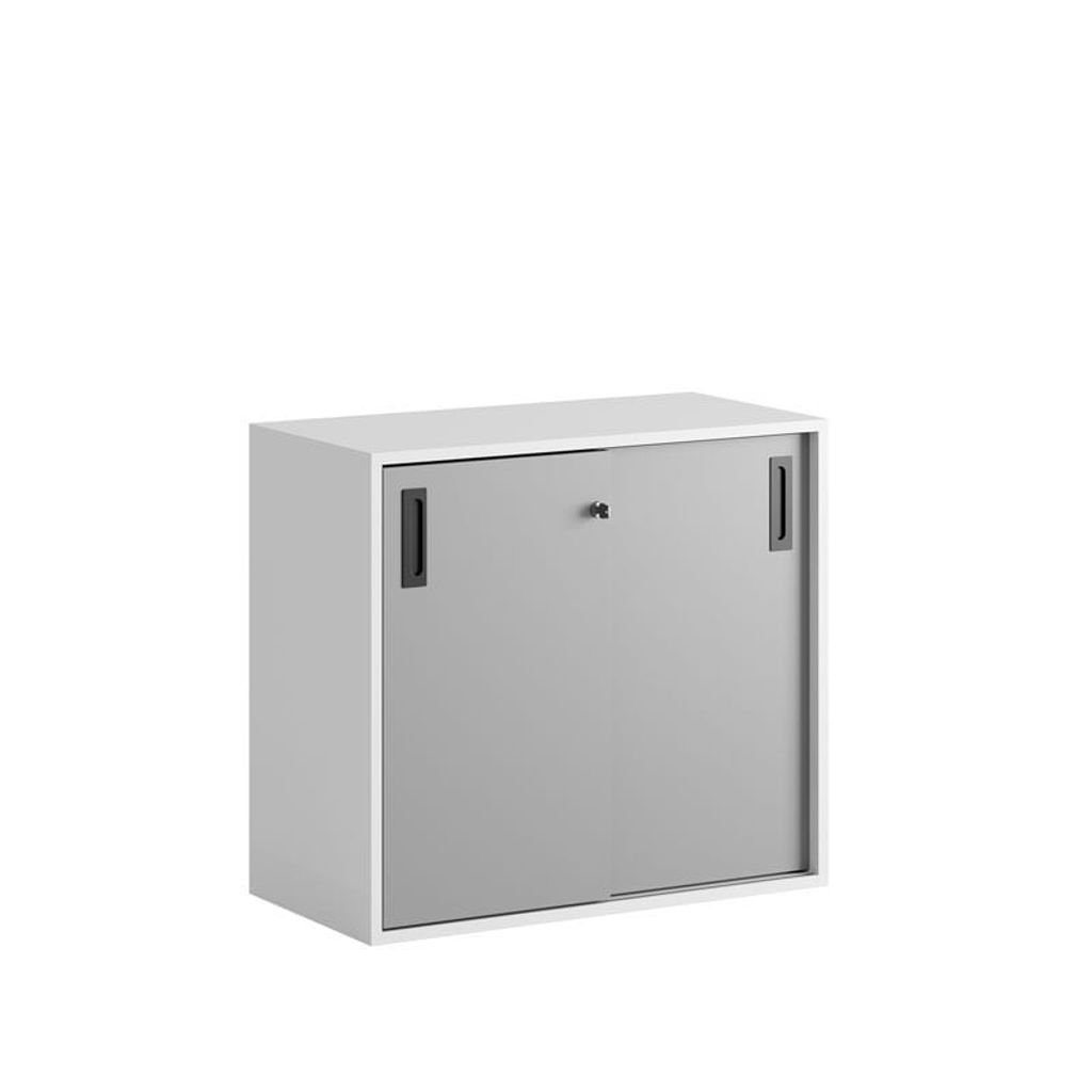 Vitt skåp med grå skjutdörrar 80x40x72 cm i Modify serien är framtagna för kunder som vill ha många valmöjligheter. Skåpet rymmer 2 pärmar på höjden. Lås med 2 nycklar ingår.