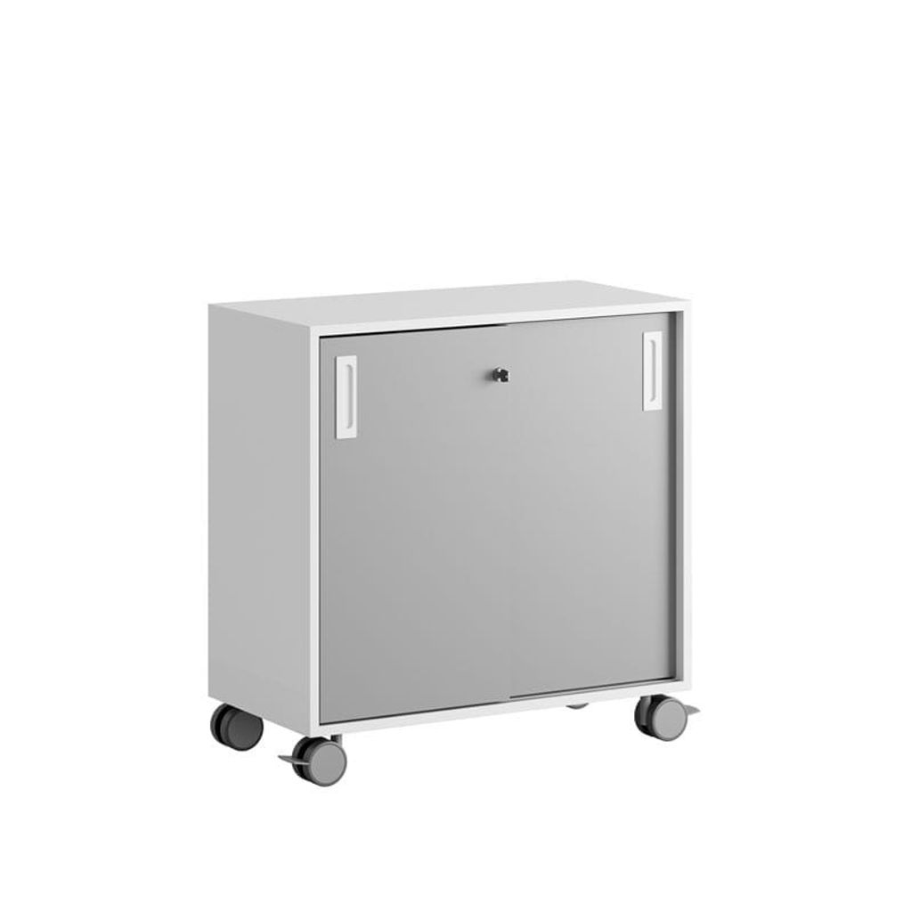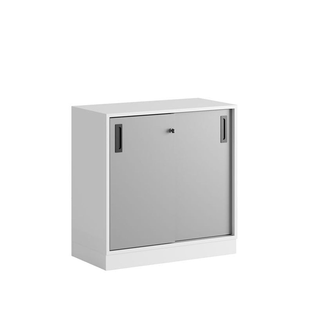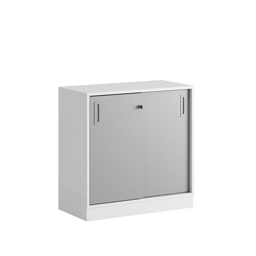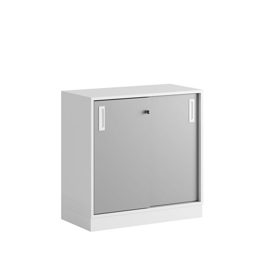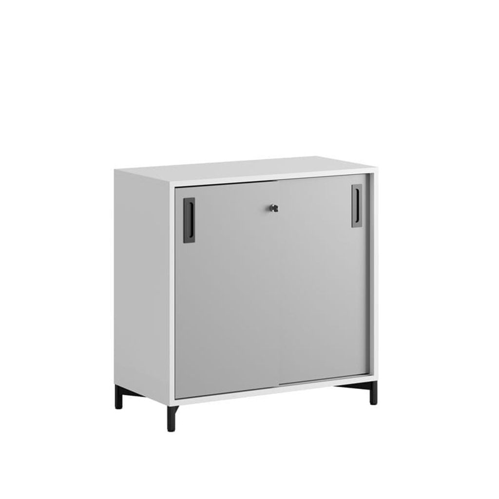 Vitt skåp med grå skjutdörrar 80x40x72 cm i Modify serien är framtagna för kunder som vill ha många valmöjligheter. Skåpet rymmer 2 pärmar på höjden. Lås med 2 nycklar ingår.