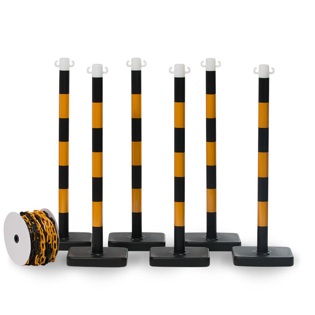 Stay out är ett komplett avspärrningskit med 6 st stolpar, 25 m kedja i gul/svart plast samt plastbehållare som man fyller med sand eller vatten för att skapa stabilitet.