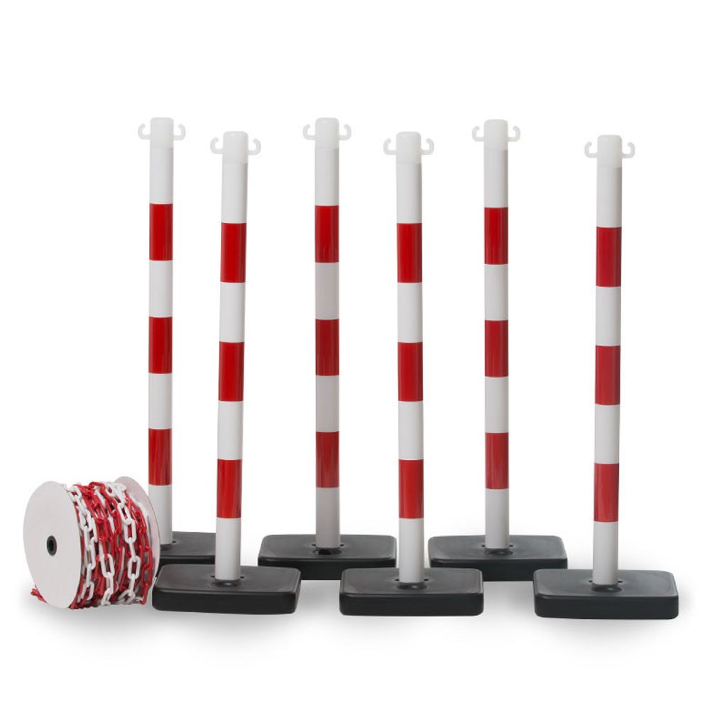 Stay out är ett komplett avspärrningskit med 6 st stolpar, 25 m kedja i röd/vit plast samt plastbehållare som man fyller med sand eller vatten för att skapa stabilitet.