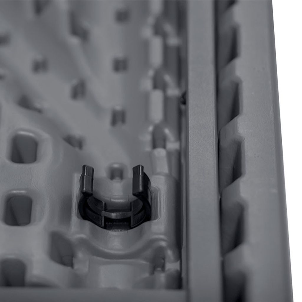 Borden är fällbara och har inbyggda kopplingsbeslag på både lång- och kortsida. Borden är UV- och vattenbeständiga och kan användas utomhus.